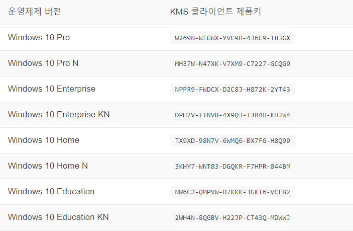 slmgr /ipk "KMS클라이언트 제품키"